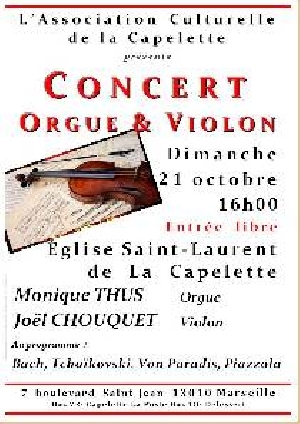 Eglise Saint-Laurent 7 boulevard Saint Jean 13010 Marseille Entrée libre ![]() Un duo Violon et Orgue, avec le violoniste Joël CHOUQUET, et l'organiste Monique THUS. Ils vous feront voyager dans de nouveaux univers sonores, interprétant, entre autres, des œuvres de Tchaïkovski, de Jean Sébastien Bach à Schubert, en passant par Piazzola, et la très viennoise pianiste, chanteuse et compositrice Maria Theresia von Paradis. Pour venir en bus : Ligne 18 : arrêt avenue de la Capelette : Delessert